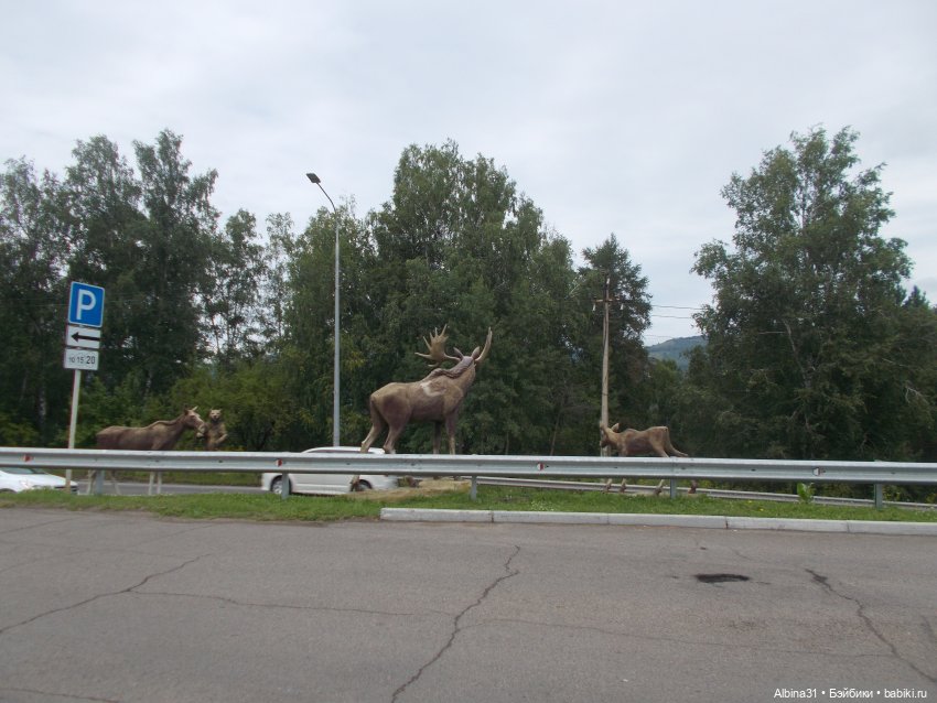 Скульптуры сохатых и медведя вдоль дороги