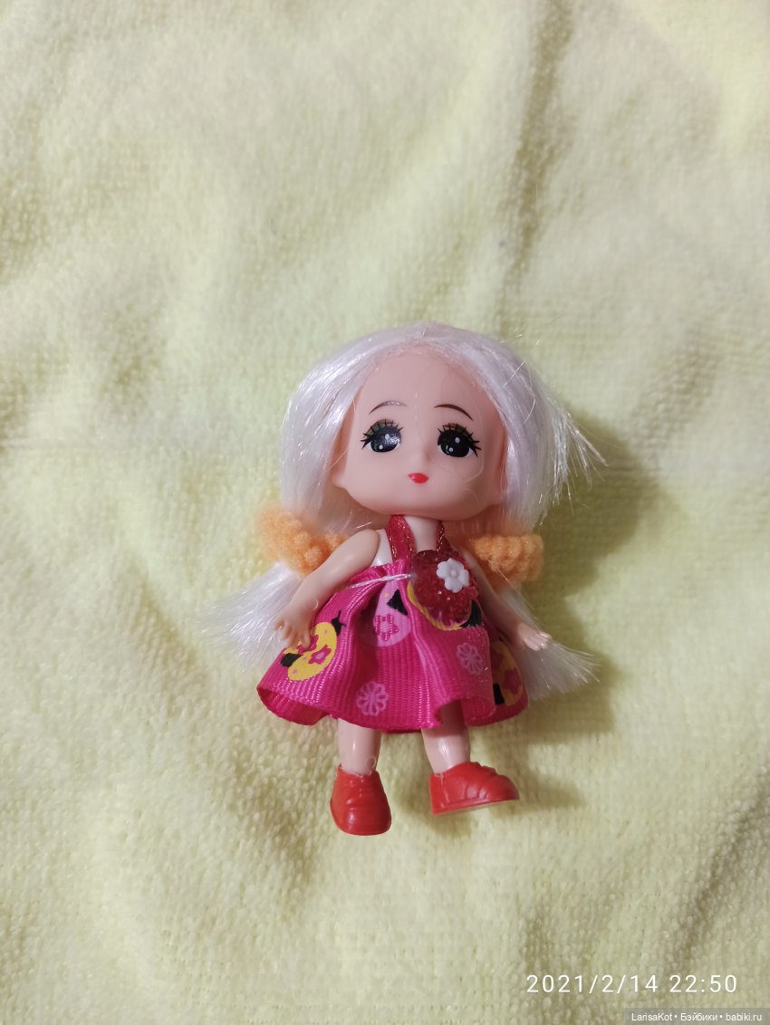 Как я и предполагала, под шапочкой волос нет, девочка — лысик. Платьице сзади приклеено к куколке. Ручки и ножки не двигаются, хотя не сделаны заодно с туловищем. Зато туфли снимаются. Рост малышки 7 см.