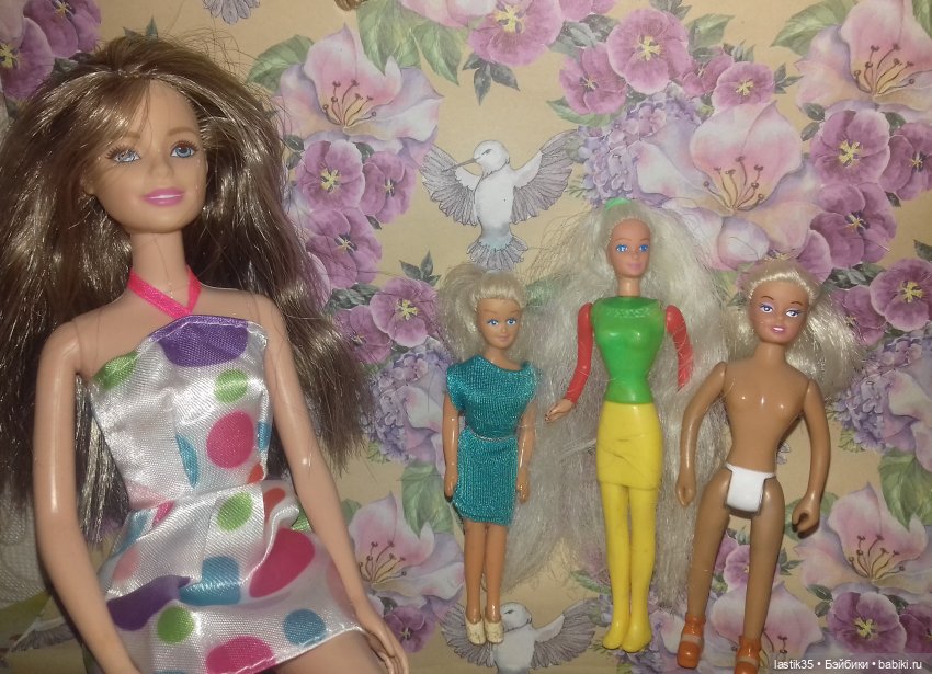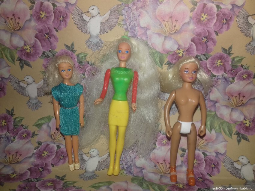 Вот нашла хеппимиловских девочек: героиня диснеевского «Геркулеса»( заводная, забавно передвигается и поворачивает голову) и три Барби( 11 см и две по 13 см ростом). Та, что в джинсовой курточке самая старенькая и лысенькая.
