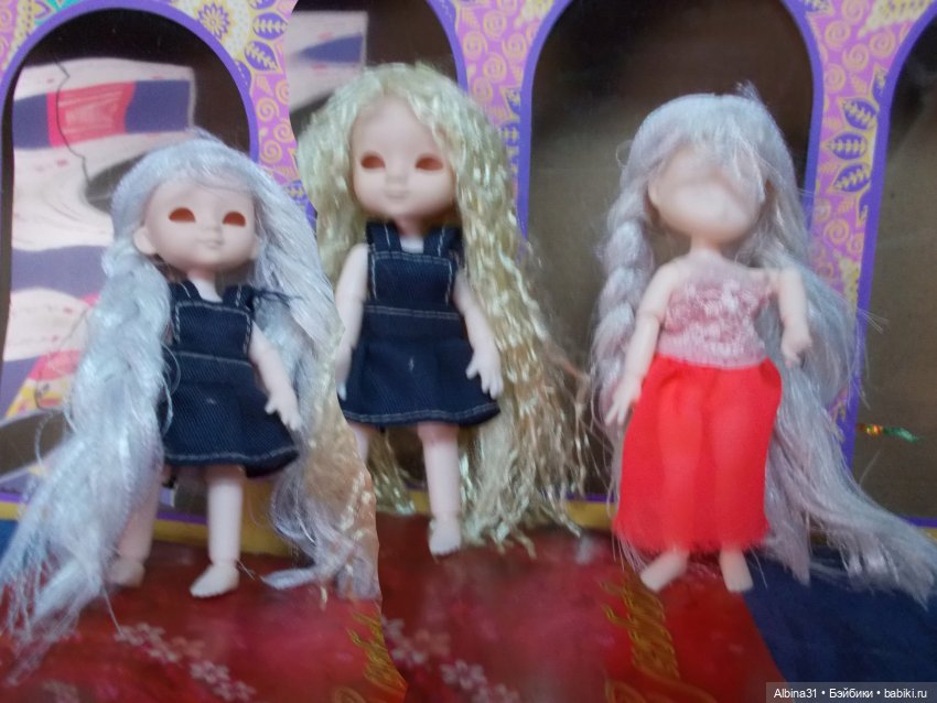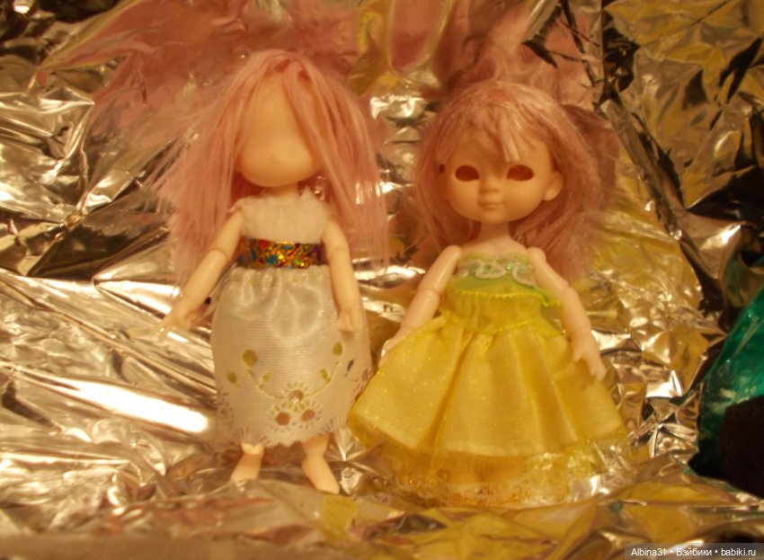 На счёт приведений это шутка. Это не приведения а новенькие малышки с Али. Верней одна кукла, а второе только тельце покупала, голова от мелкого Obitsu. Одной надо вставить глаза, другой нарисовать, а без глаз они как приведения. Пока глазами не могу заняться и развлекаюсь примеряя парички :)