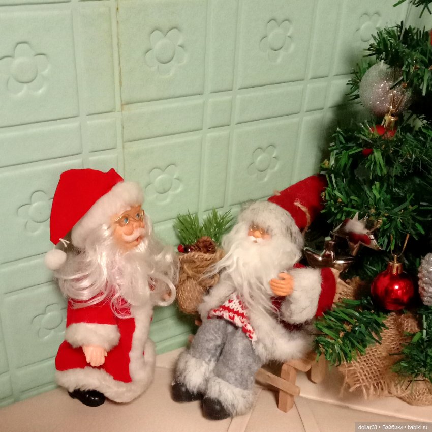 Санта из посылочки о чем то болтает с Дедушкой Морозом —
