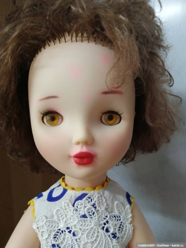 Всем доброго дня. Кто нибудь подскажет, что за кукла? Вроде советская. Глаза не родные. Были зеленые с пластмассовыми ресницами.