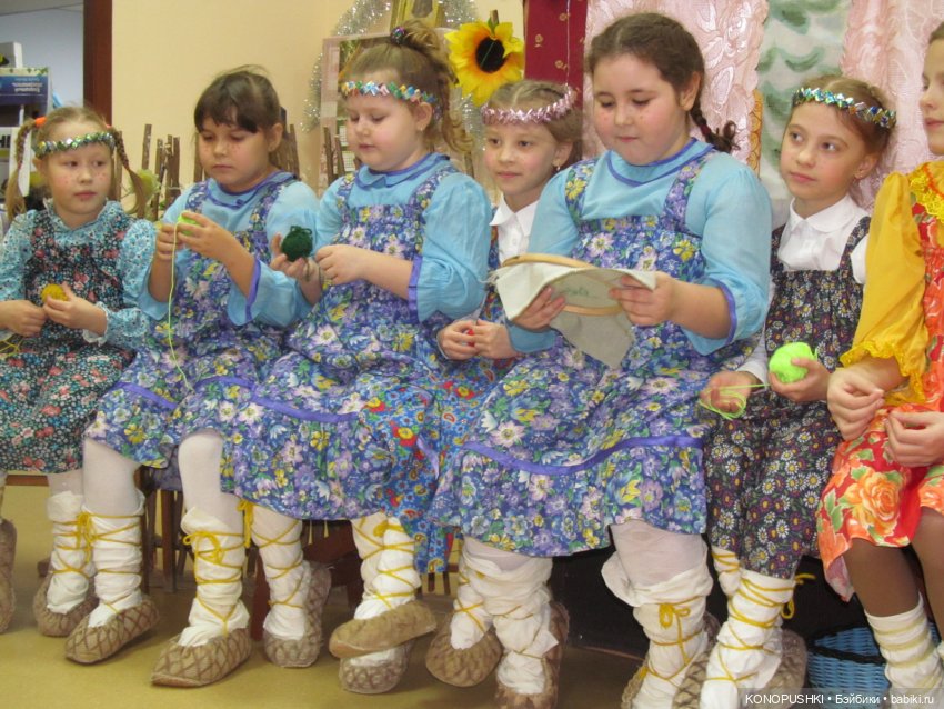 Это детишки в клубе русского народного творчества?… Надо же, лапти придумали :) Сразу, как увидела фотографию, Пушкин вспомнился :) Три девицы под окном… :)