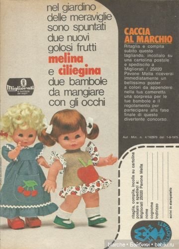Как зовут вашу малышку я не знаю, вообще, про Мильоратти как- то мало инфы, это вам не Фурга, где все молды проименованы. А этих- то и клеймили не всегда, по- моему. Но вот я нашла тоже рекламу, похожую на вашу, наверное, эта блондиночка, все же, Мелина.
