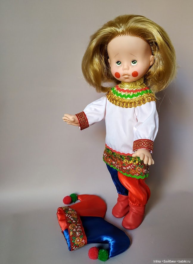 И наконец-то он ко мне приехал! Рост 45 см. Глазки нарисованные. Тело и ножки пластмассовые, голова и ручки — резиновые. Нравится что волосы длинные. И наряд красивый, сапожки ладные. Рубашка и воротник на липучках. Всё сшито аккуратно. Очень продуманный образ! Только вот почему-то очень грустный мой Скоморошек. Назвала Петруша.
