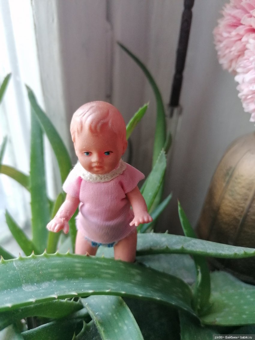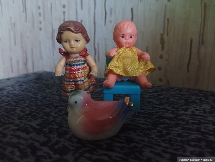 Начну с куколок, маленькие 4-6 см, были и в 70-х годах популярны, такие немецкие пупсики, у них ножки, ручки двигаются, многие их мечтали поселить, а другие имели. У меня несколько было, всех продала, а Кашка так его назвала, остался. Как память, что было детство и они были.