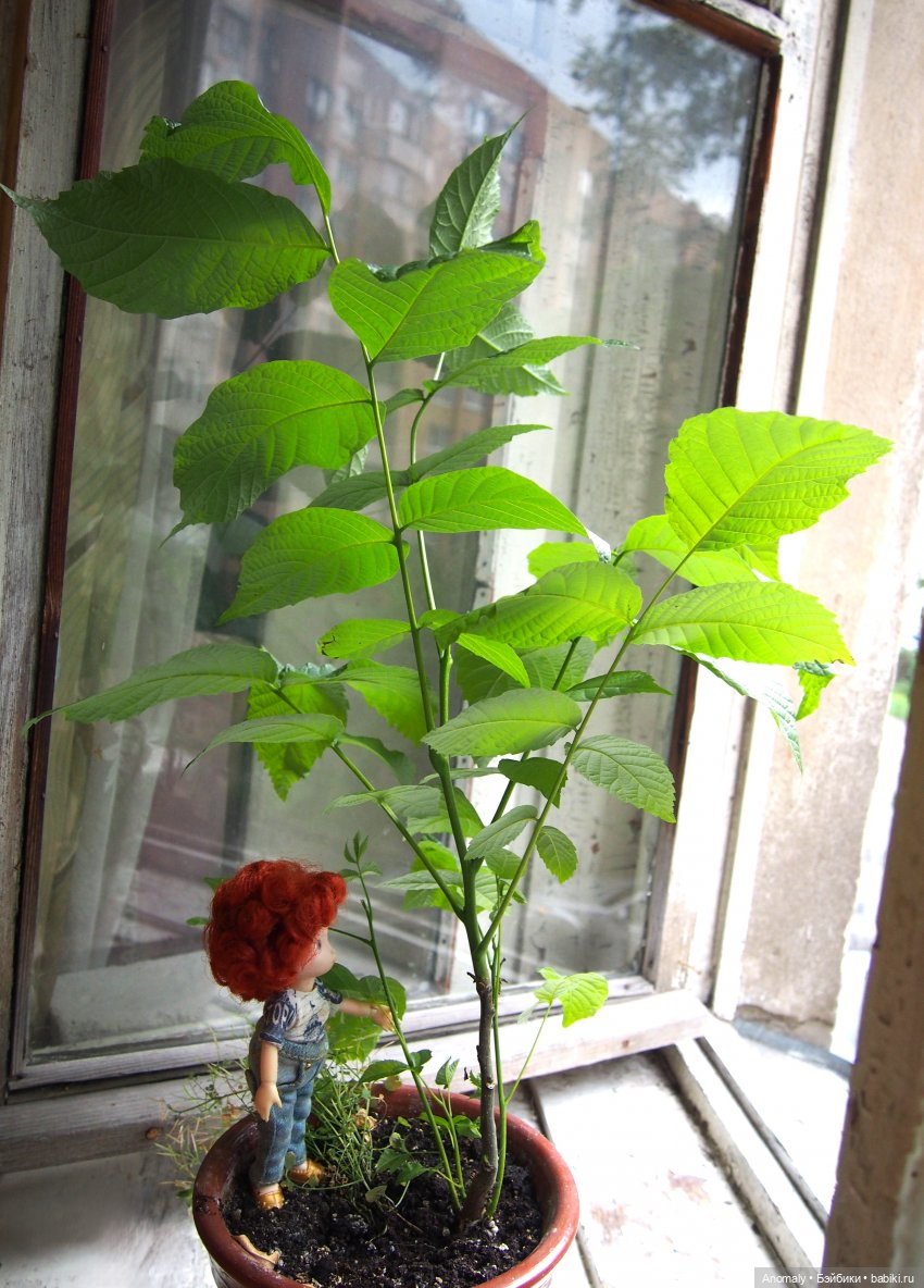 И ещё одна гордость — грецкий орех! Тоже выращен из обычного грецкого орешка купленного в пятёрочке на вес. Ему два годика только. Зимой было очень холодно, сбросил все листики и стоял голым почти до мая, мы уже думали, что всё, не вытянул зиму. Ан нет, выпустил новые листочки и попёр вверх!