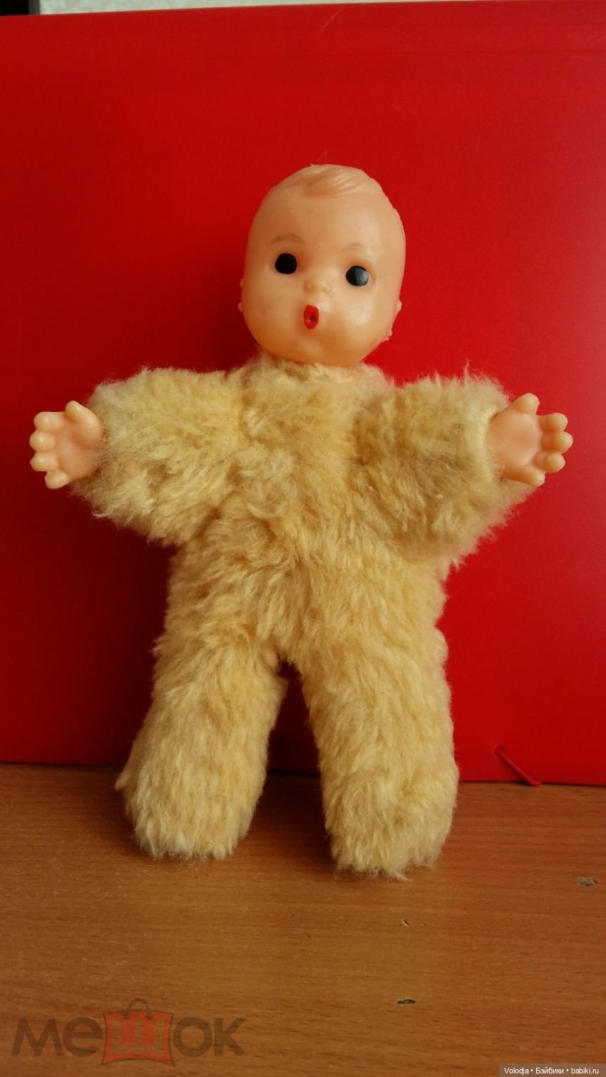 Вот такая кукла Сашенька фабрики игрушек Победа Киев СССР УССР, бывает в разного цвета в плюшевых комбинезонах, наша была в коричневом комбинезоне, цвета медвежонка или цвета мончичи, пластмассовые руки и голова, не съёмный комбинезон, купать и пачкать нельзя, рельефные волосики, капюшон съёмный, с завязками ленточками, размер куколки небольшой, сантиметров 15-20 навскидку, в коричневом комбинезоне, куколка смотрелась страшненькой и не привлекательной, а для украинской пенсии девяностых, цена куколки в универмаге, была не дешёвой, тем более с денюжек отложенных на хлеб, пытались вернуть в универмаг, но прошло несколько дней, а чек бабушка утеряла.
