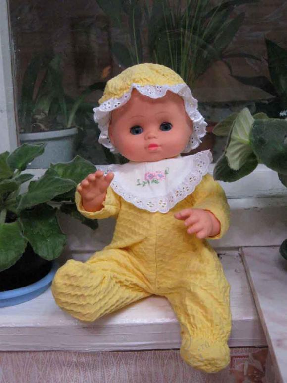 Ой, а нам бабушка на полгодика подарила точно такого пупса, как на превьюшке! В жёлтом костюмчике только. Зовут Леночка. Сначала я была в шоке, потом пообвыклась — теперь кукла мне даже милой кажется. Хотя качество, конечно!.. Больше всего убивает самый настоящий горб, там, где голова крепится к телу! Это же надо умудриться так сработать! Но одёжка вполне прилично сшита.