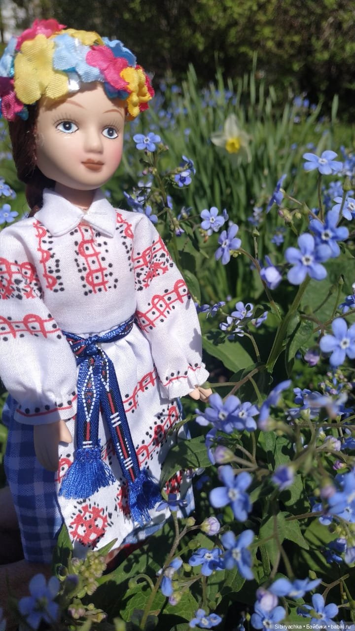 Я нигде не ползала и не лежала, все фото сделаны с куклой в руках у деревьев (кустов) или возле клумбы, но я сидела на корточках.