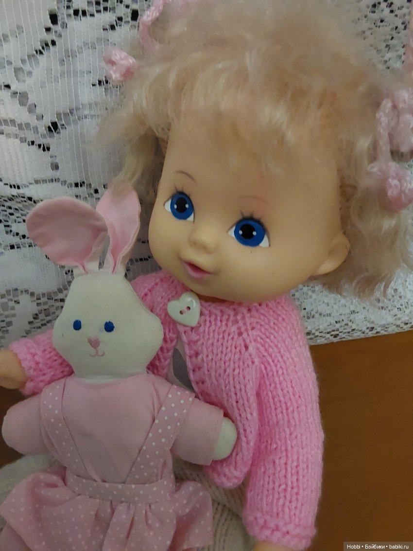 Вы помогли мне не только идентифицировать куклу, но и ее льняное платье с фартуком. Оказалось, что оно не родное, а от другой куклы. Но мне оно по-прежнему нравится, и я связала теплую кофточку, с которой это платье, по-моему, смотрится хорошо и с какой-то отсылкой к немецким куклам 70-х. Вот такой образ тоже идет Рите.