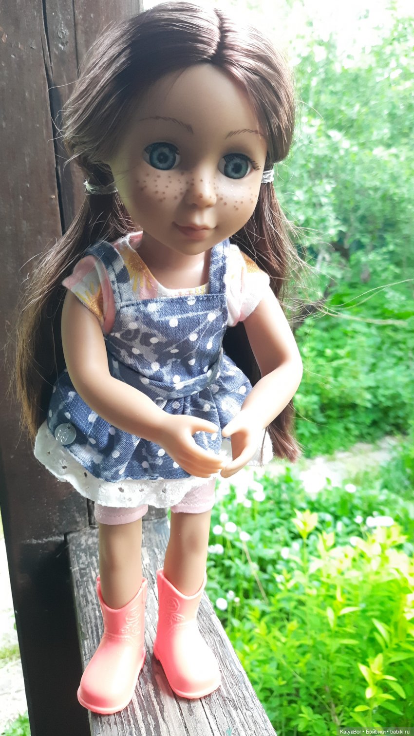 Лето! Мы переехали на дачу. Тут столько дел… Одной как со всем справиться? И я взяла помощницу)) Отличная девчонка! Знакомьтесь) У нее есть имя от производителя — Хэлли. Но мне захотелось назвать ее Леной. У нее самый дачный вид: сапожки, панамка, сарафан поверх футболки и велосипедок. И она реально смуглая, загорелая среди девочек своей серии — Glitter girls. У нее очень интересно устроены руки и ноги: внутрь вставлен каркас, она может принимать разные позы.Фото в коробке.