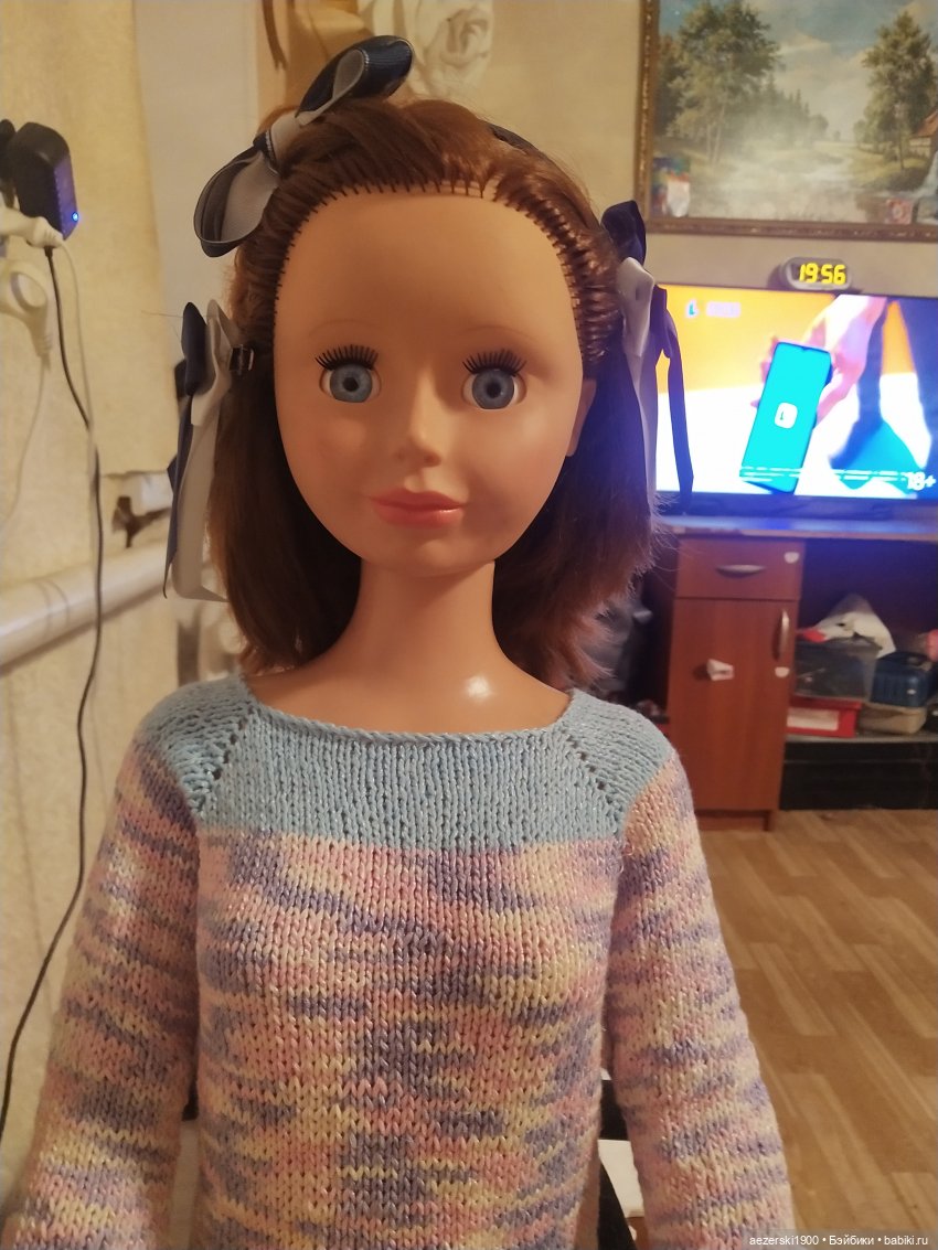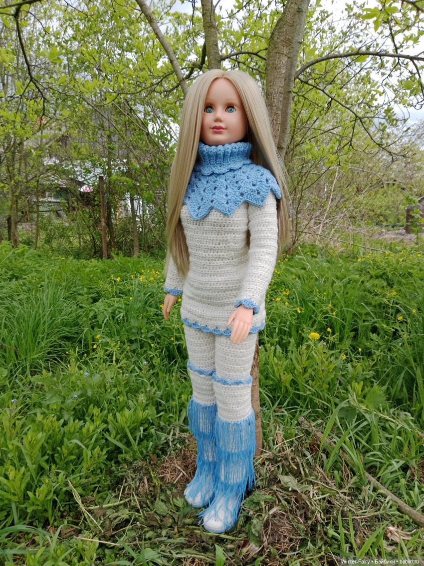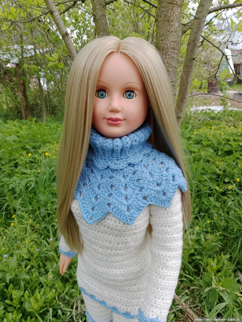 А это моя Вика. Мне ее подарили. Буквально в прошлом году.Родную одежду постирала, отбелила и повесила в шкаф. А сама ее стала наряжать. Это платье связала. А сейчас в работе другое, ажурное, летнее.