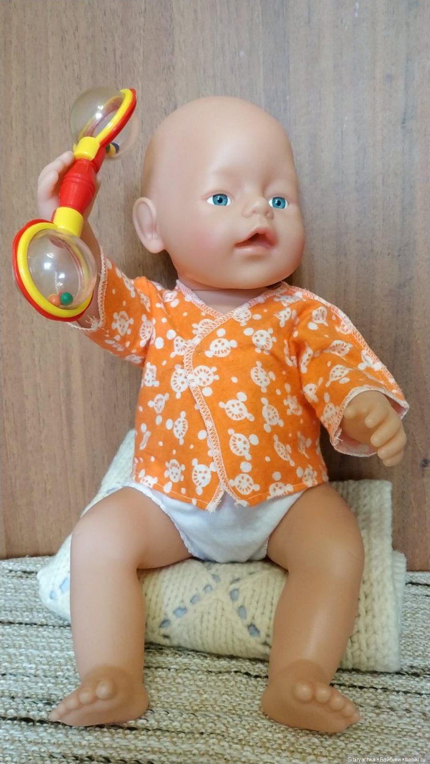 Ввиду своей конструкции малышка не может полноценно сидеть, поэтому ей нужен стульчик или какая-нибудь опора. Сегодня она сидела на чудесном вязаном пледе, сложенном в несколько раз. Мы с мужем купили этот плед, причём очень маленького размера, идеально подходящего куклам, в местном секонд хэнде.