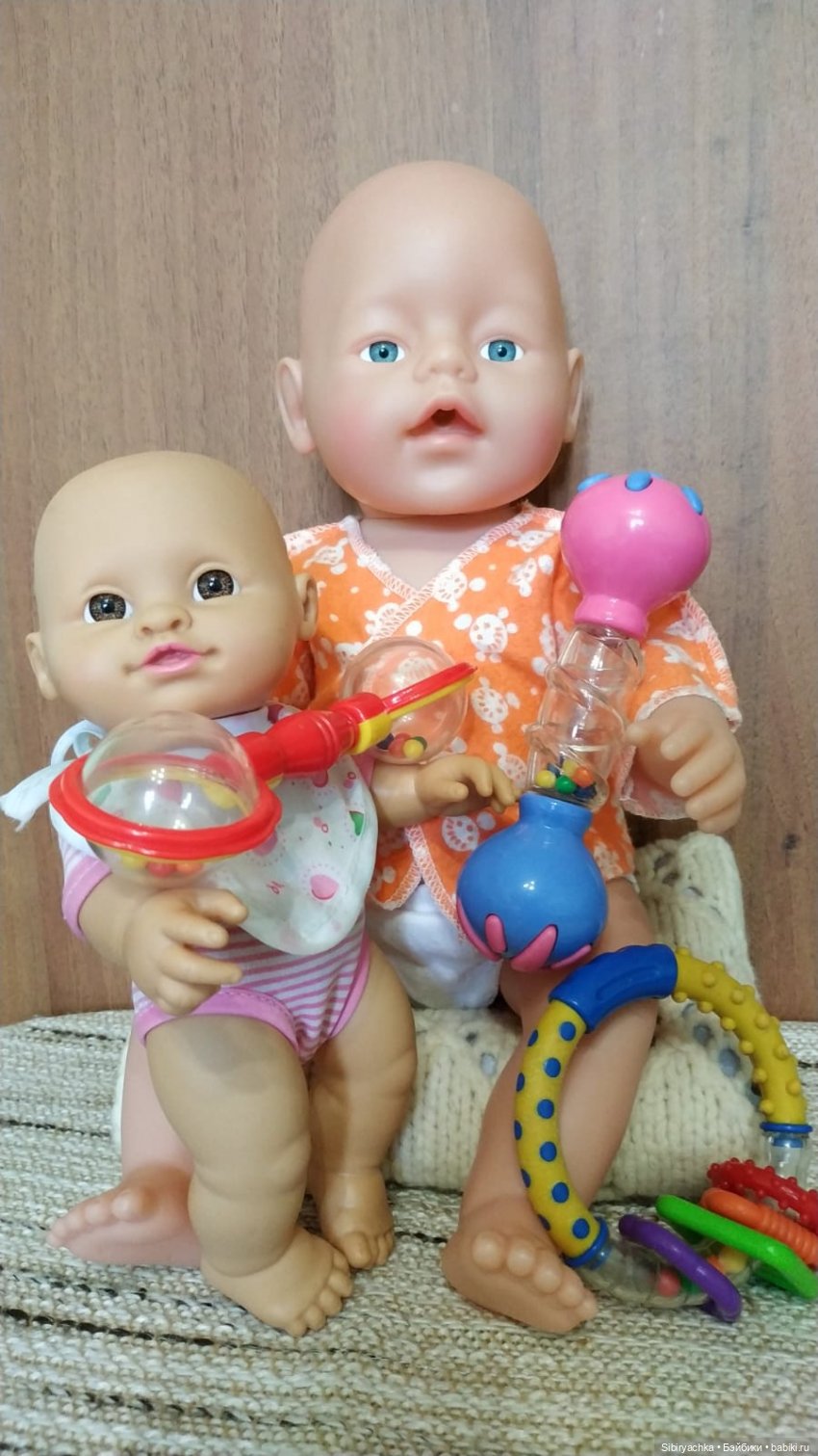Давайте представим, что малышки не были знакомы между собой и впервые увидели друг друга. Они ещё не умеют говорить, но уже отлично ладят и вместе играют с погремушками.