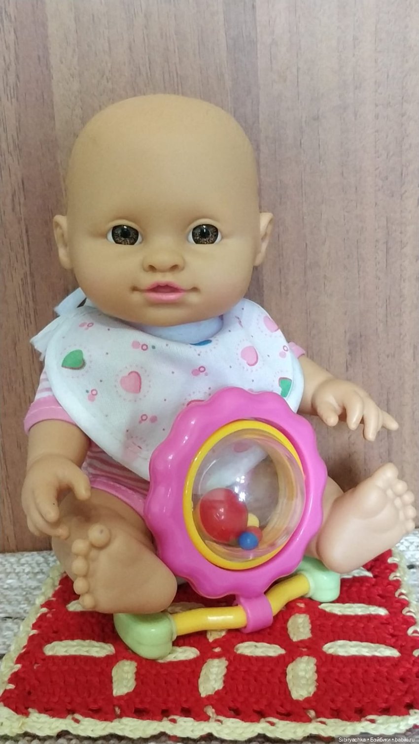 Судьба решила, что одна малышка хорошо, а две ещё лучше. В пакете с игрушками оказалась ещё одна малышка с выразительными карими глазами. Она была одета в бело-розовый песочник и панамку, образ дополнял нагрудник — очень необходимая вещь для младенцев. Я решила назвать малышку Ксюша, Ксюшенька. Имя звучит очень нежно и ласково.