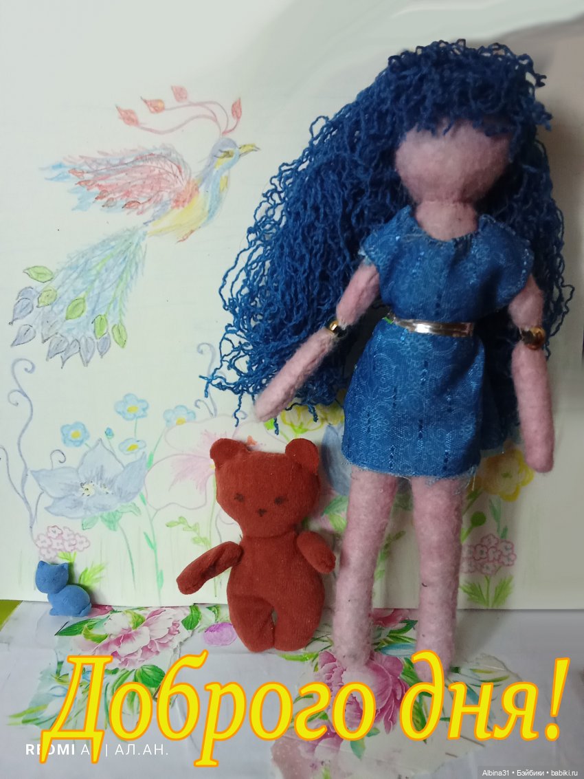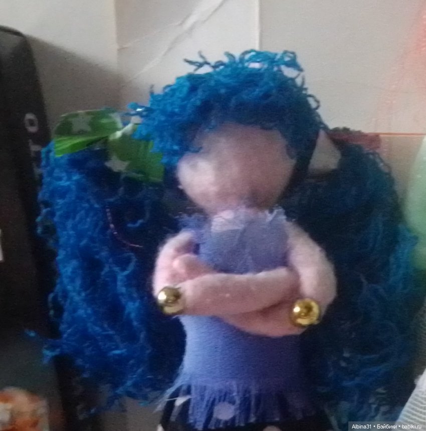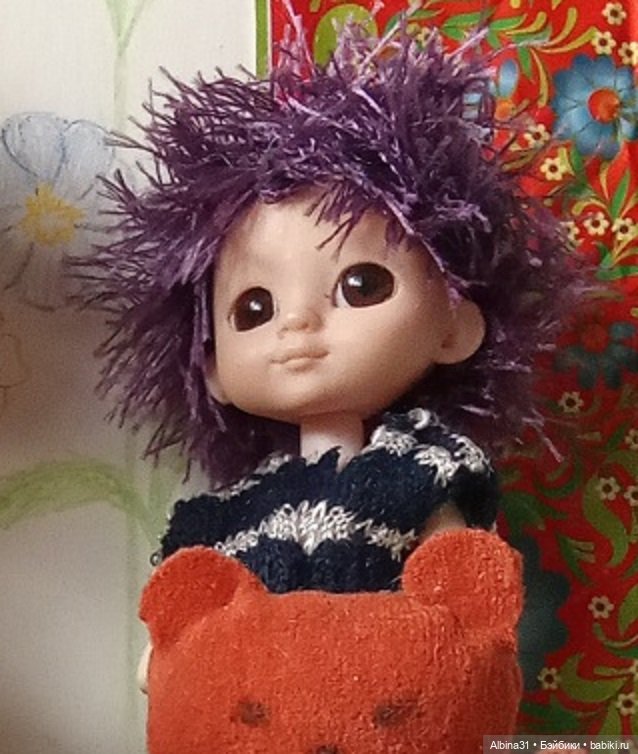 С фиолетовыми волосами прикольная девсуля! Случаем не с мультика какого-нибудь шили? Есть фото ближе?