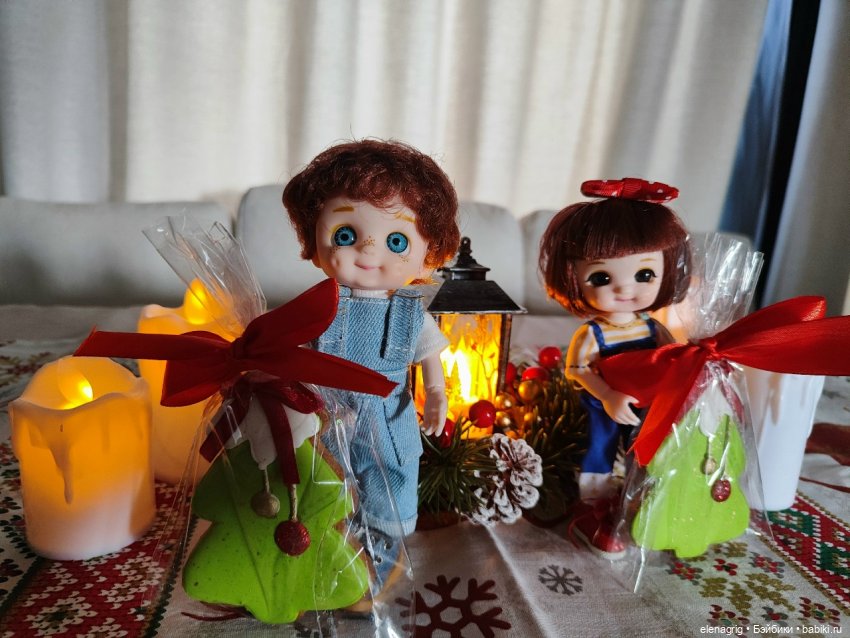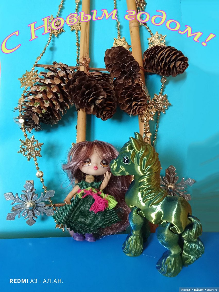 С Новым годом, поздравление и куклы.