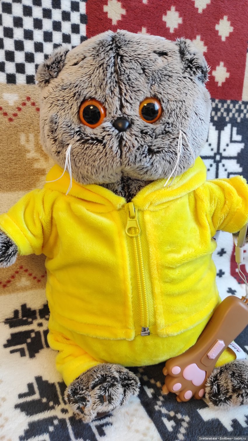 Наш Басик передает привет вашему. Хотим похвастаться своим новым жёлтым костюмчиком. Наш рост 25 см.