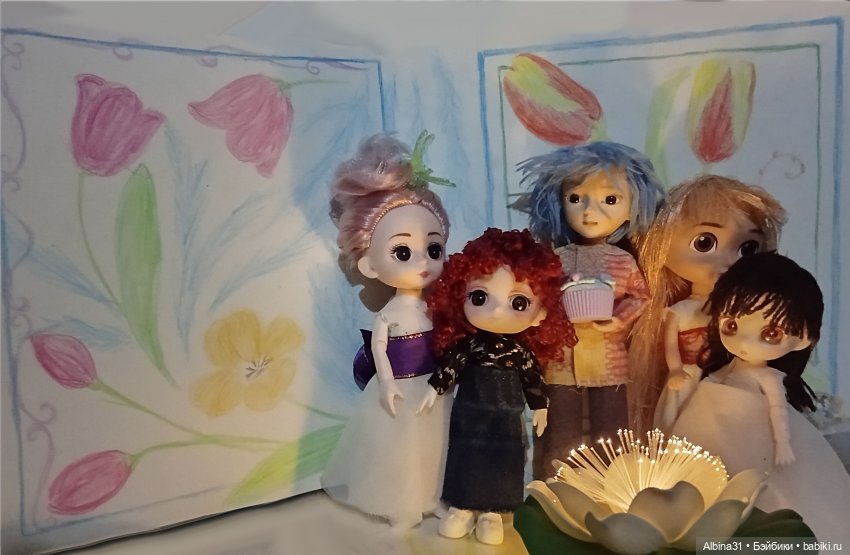И сначала, конечно, мои парни поздравили всю женскую половину нашей куклосемьи. А первыми — 5 новых куколок и тех лялек, которые появились у нас после прошлогоднего празднования женского дня.