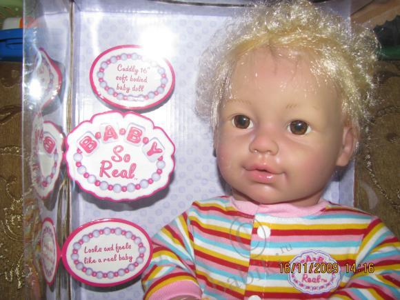 Случайно в магазине продуктов У нас поселилась малышка из серии BABY SO REAL(в отделе хоз товаров) наткнулась на них!!! Сидят себе тихонечко на нижней полке, скучают, их даже никто не замечает! Я как увидела… обомлела, ну, прям, игровые реборны, как маленькие детишки! И цена нормальная! Вообщем, купила и радуюсь теперь!!! Сделала фото другой куклы в коробке на телефон: