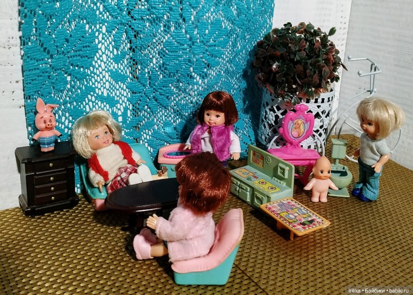 На этом фото блондинка была выброшена… Две брюнеточки и розоволосая куколка( фото ниже) с самодельными паричками. Они от одного продавца. Две были присланы в подарок, но лысенькими. Моя знакомая сделала им парички из шерсти, а я парички чуть преобразила… розовые косы распустила…