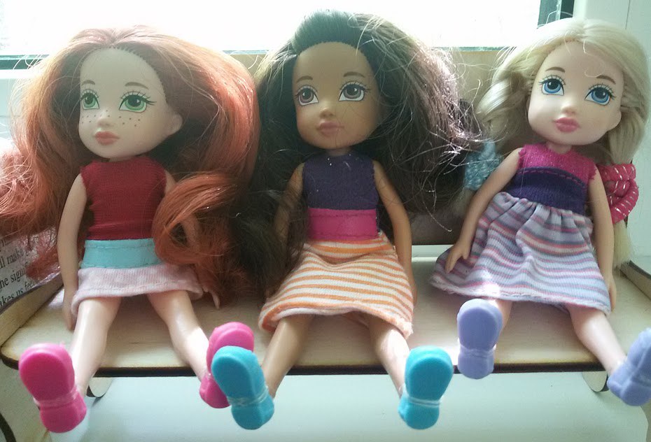 Эти забавные девчонки вообще волей производителя были посажены на примитивные и крошечные тряпочные тела. Беда просто. Переехали на тела Полинок и рады-радешеньки )