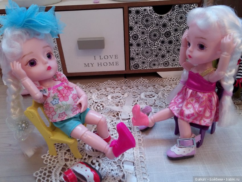 У меня вот руки никак не дойдут до моих двух сестричек, одна даже обиделась и переодеваться не стала… Первая уже освоилась, переоделась. Образ уже вырисовался, пора видоизменяться, тогда может и имена придут. Пока бастуют мои девочки — ни одного имени не предлагают, внимания к себе требуют)
