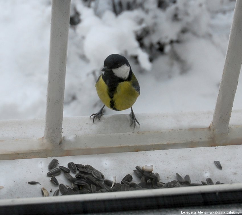 -Лина, идём домой, из окошка будем наблюдать за птичками… Жаль что ещё нет снега, на белом фоне кормушечка смотрелась бы гораздо веселее.
