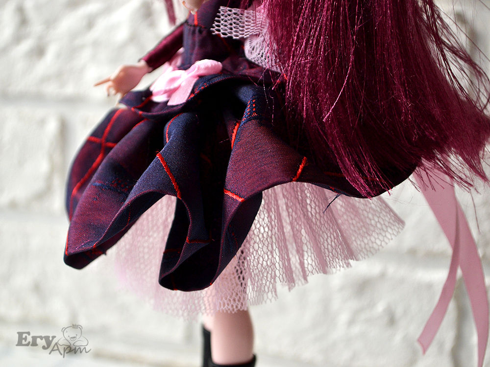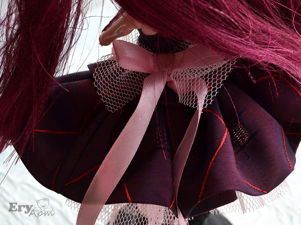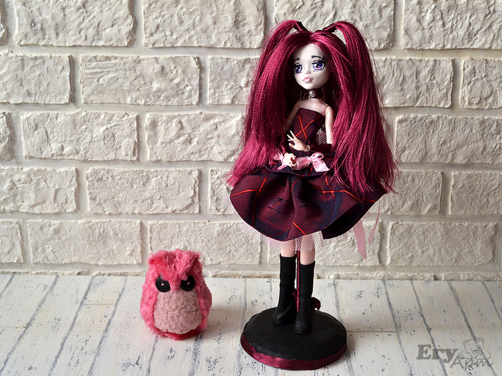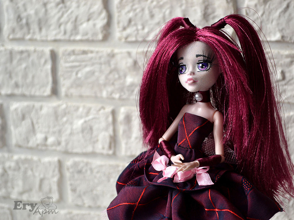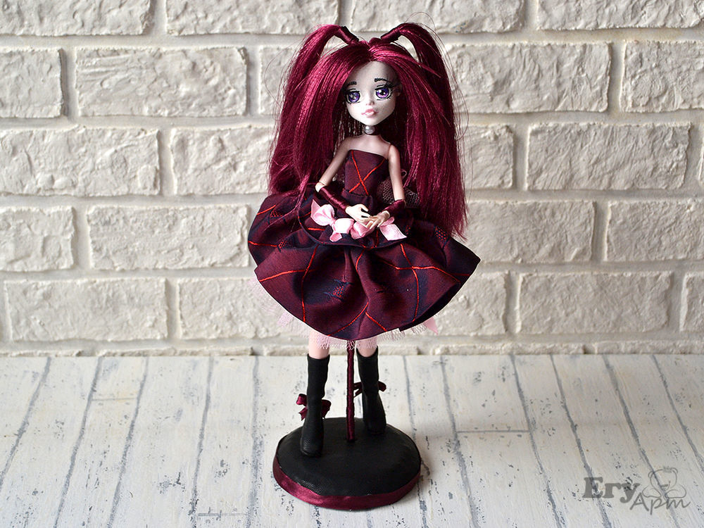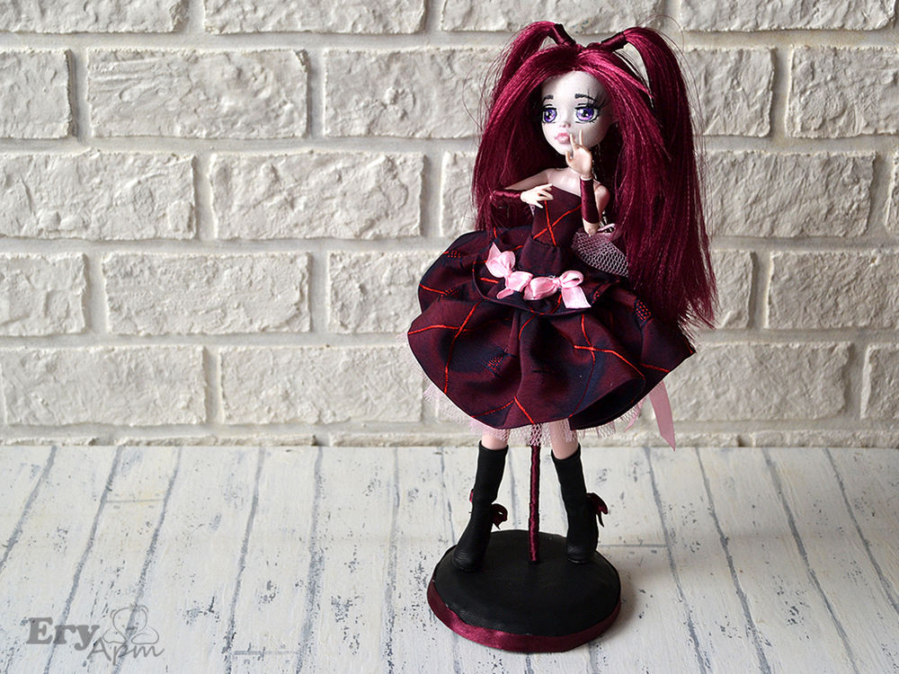 Точно не знаю как стиль называется, я сокращенно назвала ГотиЛоли. За основу взяла, самую дешевую подделку под МонстерХай. Голова была ярко малиновой, перекрыла акрилом, нарисовала глаза в стиле аниме, приклеила ресницы.