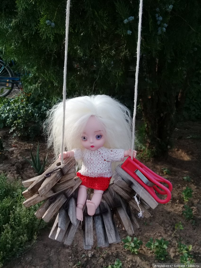 Наша Ягоза, тоже пока без имени))) летом по приезду и на качелях из прищепок покаталась