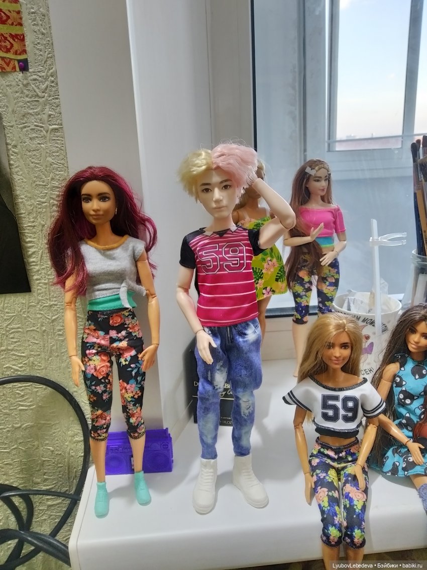 Прямо расстройство — размер одежды. Всё что у меня есть мужского (от экшенов и кенов) ему велико. Подходит девчачья, в смысле — барбейская одежда. Но поди подбери, чтобы мальчику подходило. Страдаю по хорошей мальчиковой одёжке. Сценический костюм как-то мне не нравится, я кэжуал на куклах люблю. Готового ничего не вижу подходящего. Загвоздка…