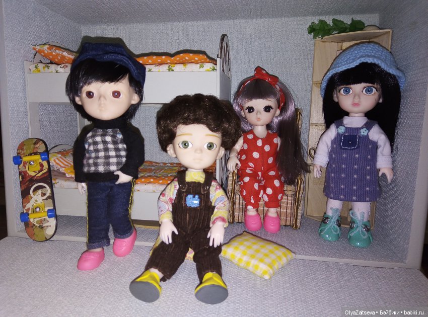 Как только они приехали, дочка освободила полочку на стеллаже, выделенную для ее кукол, и обустроила ее как комнату только для этих маленьких китаечек