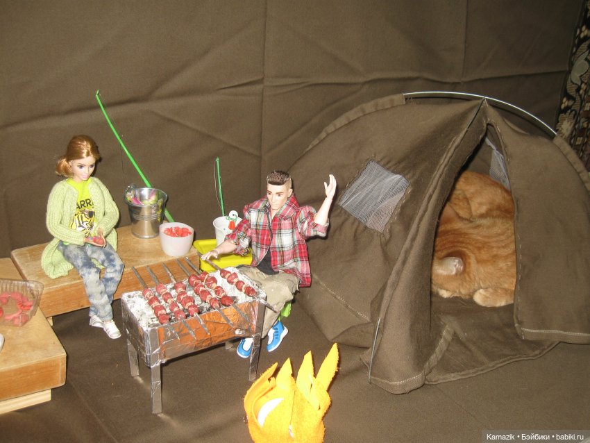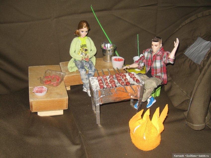 А меня сбила с толку ткань как у палатки! Ещё подумал — вот ведь какая палатка вместительная оказалась — всё в неё влезло, и даже с костром!))))))))) Ну, так дичь, конечно — костёр в палатке, но если костёр кукольный — почему бы и нет? Ведь в юртах костры разжигают, почему бы в такой гигантской палатке не разжечь))