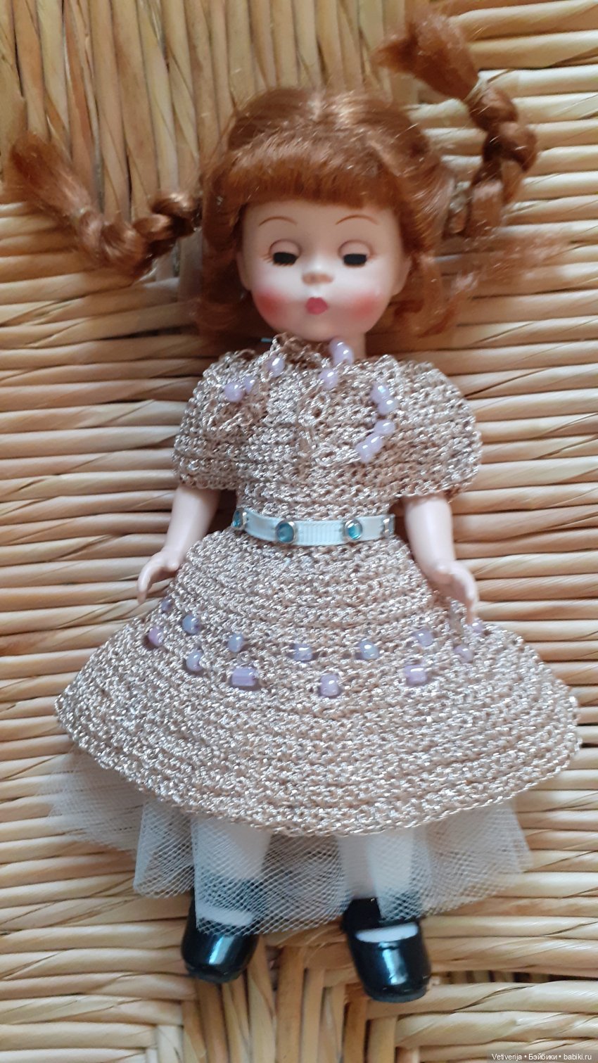 Кукол я стесняюсь с собой в больницу брать. Но вот, прикрываясь дочкиными куклами, там за 14 дней связала на глаз такое платьице для 20 см куколки Мадам Александер. Вязала оставшимися, не раненными и не перебинтованными, пальцами ;)))