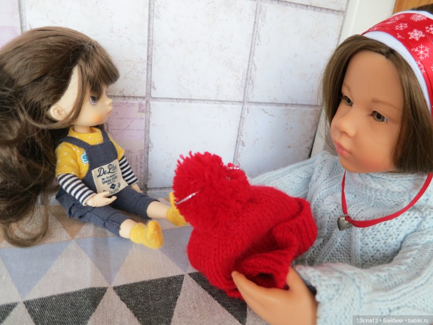 Вязаную шапочку Эмилечка подарила Обижульке ещё до того, как задумала найти позже и тёплые валеночки для неё.