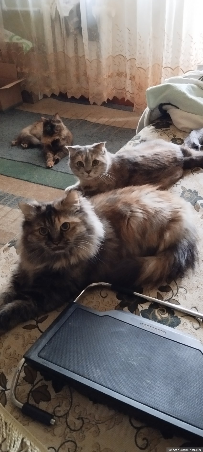 А эта моя усато-хвостатая семейка, в порядке лежания по убыванию — Фаня, Кася, Рыся.
