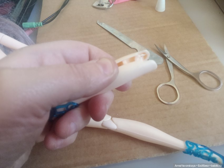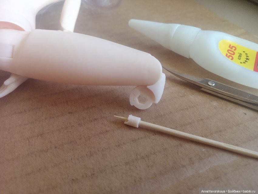 Затем аккуратно промазала швы ножки и края шарнира секундным клеем, надела ножку и крепко держала. Потом я ещё залила клей в сам шарнир и аккуратно двигала туда-сюда, чтобы не приклеилось ничего лишнего.