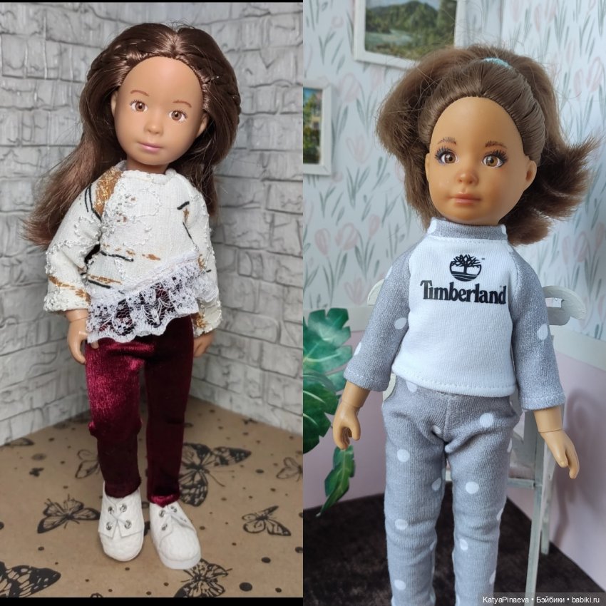 Штаны от лол на девочках сидят так себе, лучше всего на Джуниорке, у нее тело по форме ближе, А на Крузике ( Рыжулю фоткать не стала) в области попы висят по понятным причинам, да и рукава коротковаты опять же исходя из того, что длина руки у Софи больше, но если доработать выкройку, то выйдет отличный комплект