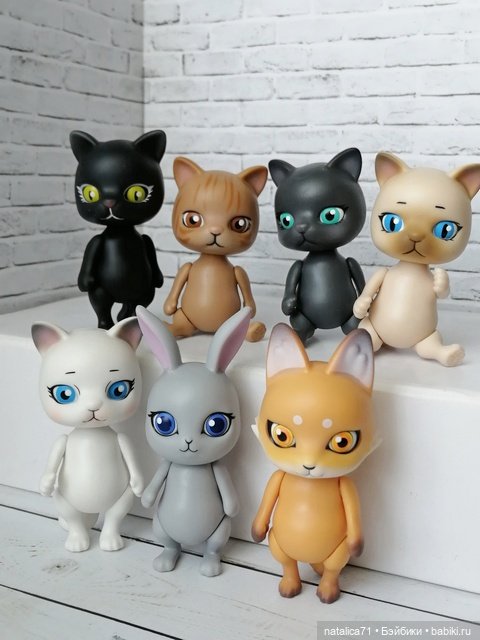 Вслед за лисичками ко мне приехали не менее милые котики. Тоже пять разных: белый, серый, черный, бежевый и светло-коричневый. Двух последних я оставила себе, а остальные отправились в шопик. Размер у них такой же как и лис — 8 см.Виниловые. Тело отличается от тел лисичек.