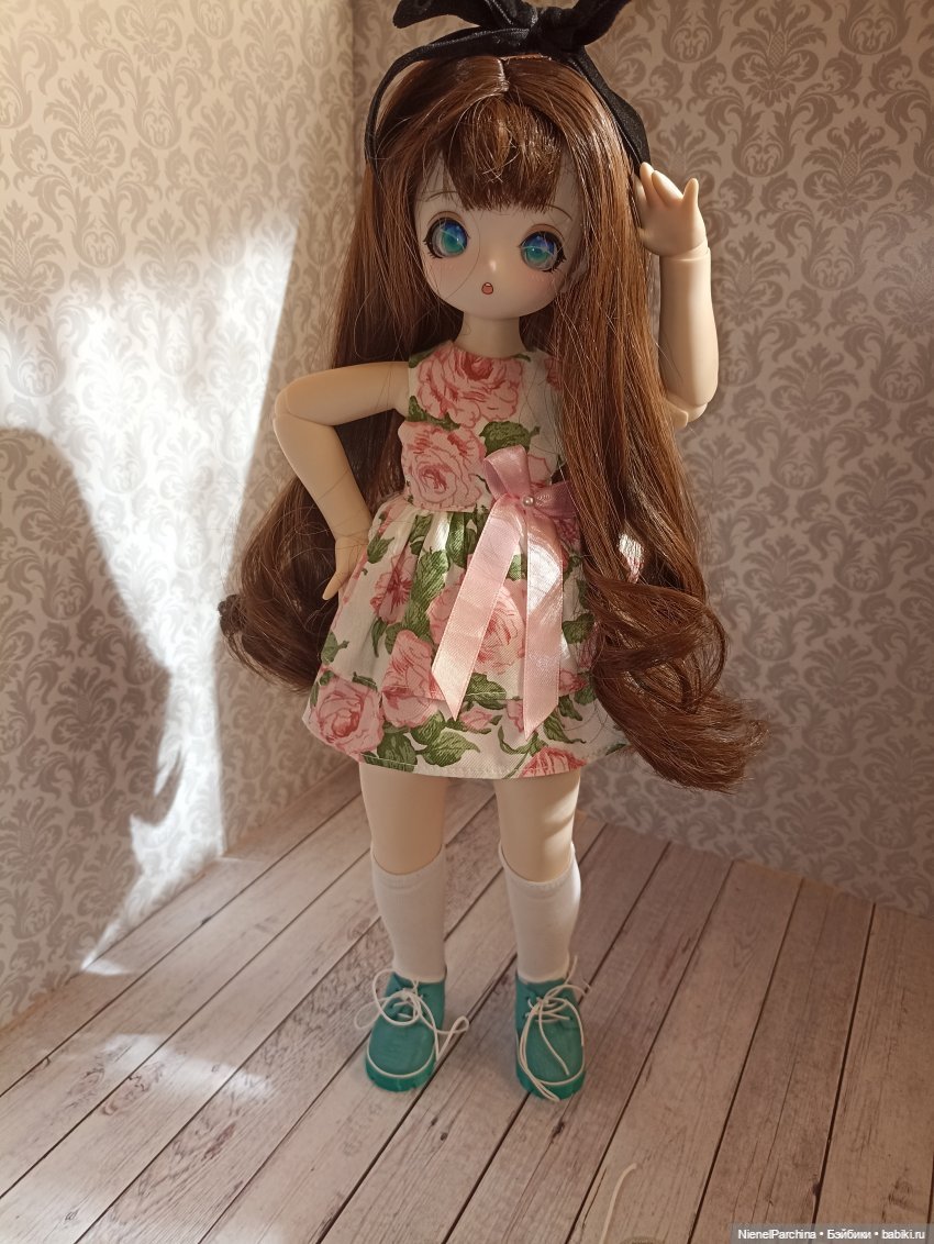 Кукла оказалась внушительного размера, я почему-то думала, что она будет гораздо меньше) Конечно, я знала, что она высокая, но она оказалась ещё и очень крепенькой — пухлые ножки, самая довольно тяжелая, и, наверное, именно поэтому она кажется мне больше, чем должна быть.
