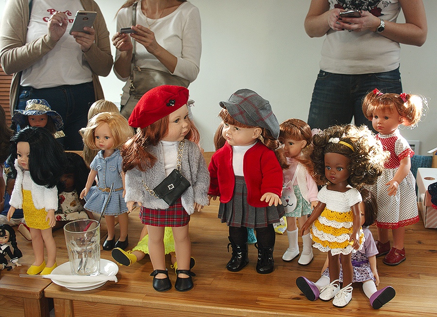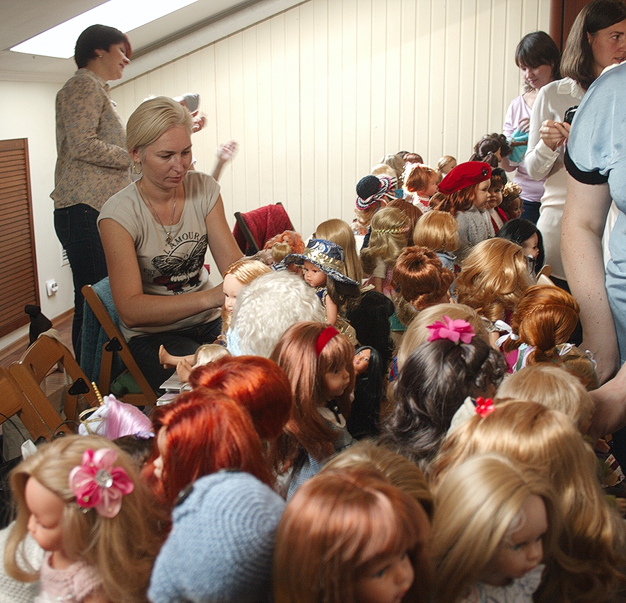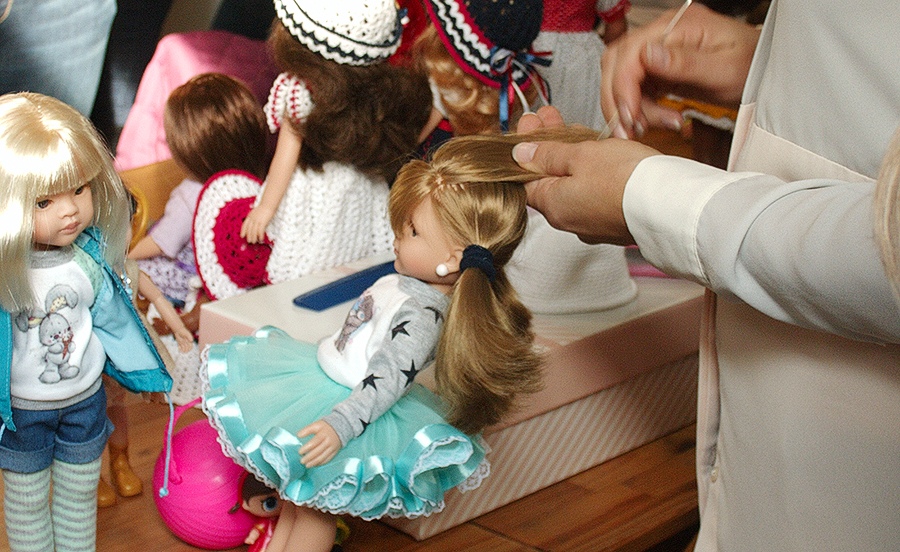На встречах часто проводят мастер-классы, тут Элина Саткунайте показывает, как исправить пробор кукле.