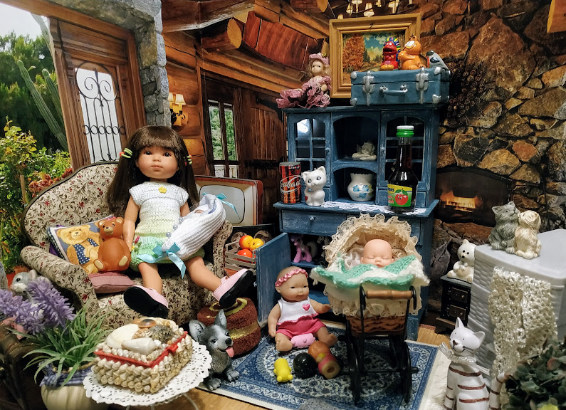 Пока бабушка в гостях, мвлыши открыли буфет, один малыш уснул, другой малыш вытащил игрушки, а Майка уселась с игрушками в бабушкино кресло.