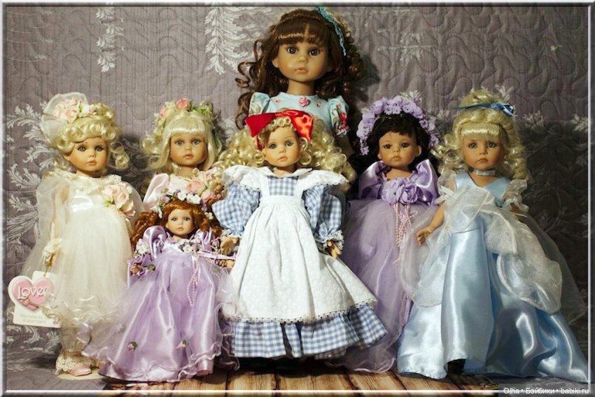 Ещё хорошо смотрятся в этой компании линдорики — куклы Линды Рик. Прошу прощения за старое фото, более хорошего у меня пока нет. Вот 5 кукол в центре имеют рост от 12 до 14 дюймов и очень схожие размеры с паолками, даже нарядами некоторыми меняться могут: