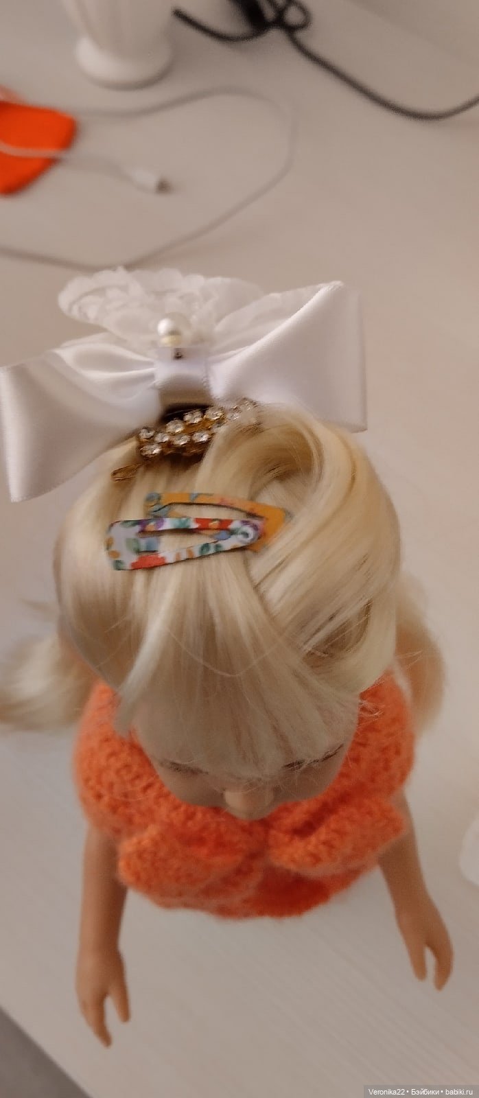 Хочу открыть вам одну маленькую хитрость. Не знаю, может быть она уже всем известна, что ж напомню еще раз. А хитрость вот какая. Как сделать челку кукле без челки? Берем прядку волос надо лбом закручиваем, кончик опускаем на лоб и закалываем. Все, челка готова! Причем любой густоты и длины какую вам надо. У моей Клавы на фото такая челочка.