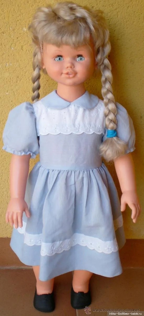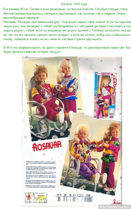Я о таких куклах ничего не знала, просто стала искать информацию в гугле — куклы начала 90 х, испанской фирмы Jesmar которой уже вроде бы и нет. Даже рекламу нашла английскую, стоили они тогда 35 кажется фунтов что для тех времен было относительно дорого для куклы. Если ее держать за руки и как бы вести на себя то она как будто бы идет. Вроде как были и говорящие варианты. На вторичных рынках искала чтоб посмотреть какие у них были тогда наряды, оттого и вопрос, кто -нибудь здесь знает? Может быть есть у кого эти куклы. Пока нашла только такие фото( это не мои) похоже такие спортивные костюмы это как раз в чем они точно были в те времена.