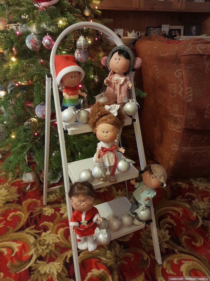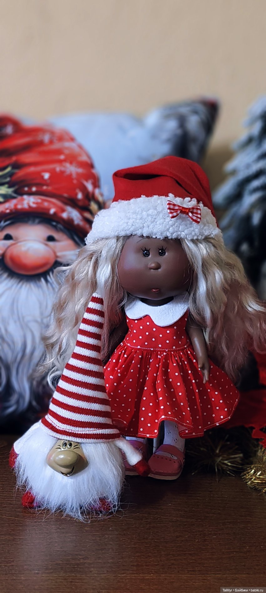 Волосики у Дуси новые, а вот одежды у нее совсем нет. Только сарафанчик на голое тело был одет и туфельки. Футболочку мы взяли у Пашки, на первое время. Но ведь не будешь так Новый год встречать? Каждая девочка хочет быть нарядной! Поэтому в подарок Дусенька получила платьице и новогодний колпачок и стала похожа на маленького гномика!