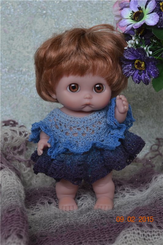 Так они и стояли, пока моя подруга Лена не заказала мне связать нарядик на ее такого же как Лила пупса. И пришлось мне мою малышку открепить от коробки для примерки. Как только я ее освободила от коробки и взяла в руки мое сердце екнуло. Какая же она прихорошенькая, пухленькие со складочками ручки и ножки, прикольный пузик, густые прошитые волосики. Единственный минус, на мой взгляд, у этих пупсов нет не бровей не ресниц. Ну так как у меня руки ростут так как надо, не долго думая, прилепила я ей реснички. И она стала еще лучше. С большим удовольствием я связала один нарядик на этого чудного ребенка. На мой взгляд получился очень примиленько.