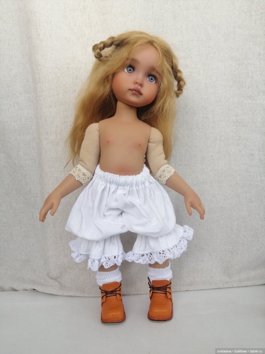 Куколке и в этот раз я поменяла её родное тело на текстильные, с каркасом внутри.