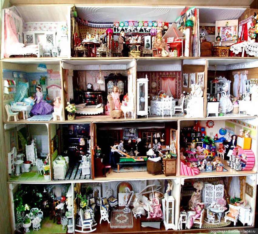 Этот домик сделал мой муж. На самом деле в нем четыре этажа. Но на тот момент готовы были только три. Часть кукол в нем переделана мной из разных феечек или новогодних игрушек, часть куплена, конечно, специально для домика. Убранство домика и интерьер тоже частично сделаны моими руками)